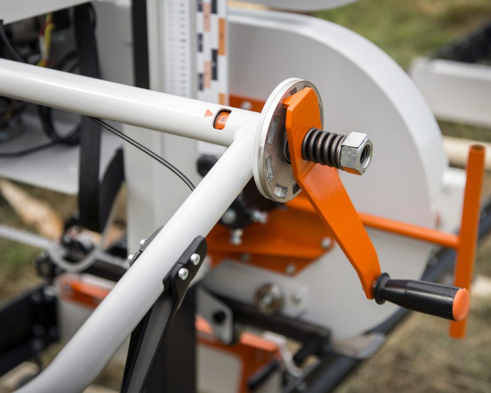 This sawmill model combines well-tried functions with innovative solutions. The saw head is adjusted in fixed steps, which gives you a quick and exact setting of depth of cut. The simplified setting of depth of cut is a clear legacy from the adjusting crank of the Logosol M8 sawmill. One rotation of the crank is always 1 inch, and one additional step compensates for the kerf.