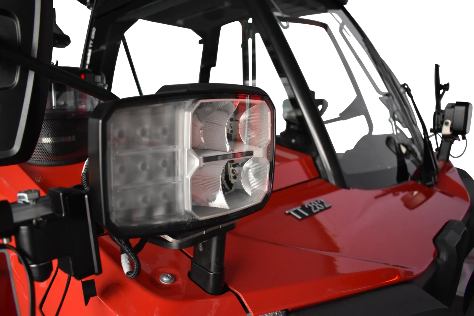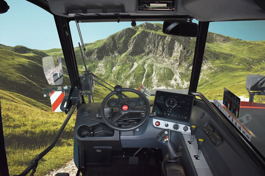 The cab is designed for long days: heating, air-conditioning, dust filter, bottle and phone storage, optional air-suspension seat with swivelling device, electro-hydraulic clutch, reversible fan, and bright LED lighting. That comfort helps you get the best from Terratrac slope tractors in every season.