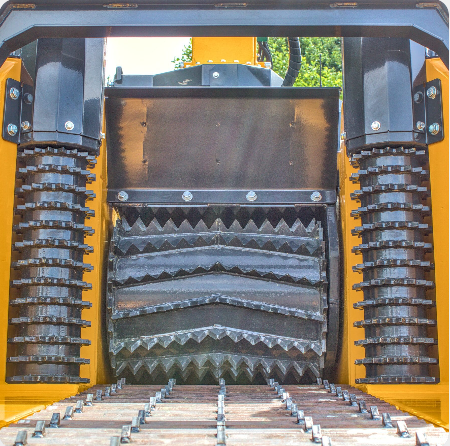 Inside the chamber, the ARBMAX D45X 18″ Drum Tracked Wood Chipper runs a 4-knife drum rotor with one anvil to produce consistent, controlled chip. Furthermore, the system is designed for quick-change blades, so you can swap knives rapidly and get back to work with minimal downtime.