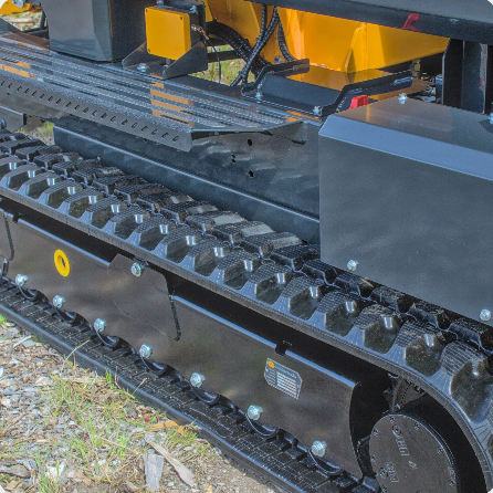 Because many jobs involve rough or soft ground, the ARBMAX D45X 18″ Drum Tracked Wood Chipper sits on heavy-duty rubber tracks rated up to 8,000kg. This undercarriage offers high ground clearance and a long track base, which together reduce ground pressure and improve stability.