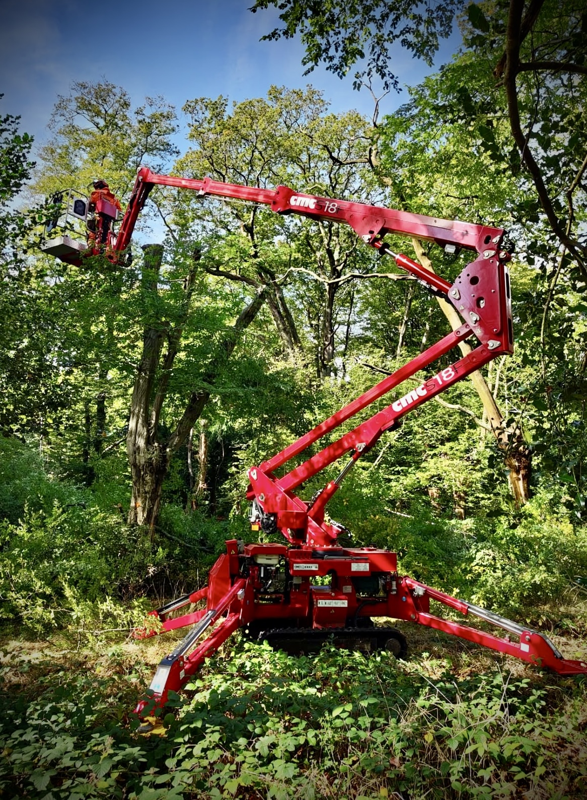 Built to withstand intensive use, the CMC S18F Access Platform delivers durability and strength even on demanding surfaces. Its high-grip tracks, combined with a robust stabilisation area, allow safe operation on gradients up to 34° (67 %) and travel slopes of 18–32 %. Furthermore, with a total weight of 2,495 kg, it remains steady even when fully extended. This makes the S18F spider lift particularly suited for arboricultural work, façade maintenance, and construction in uneven or sloped areas.