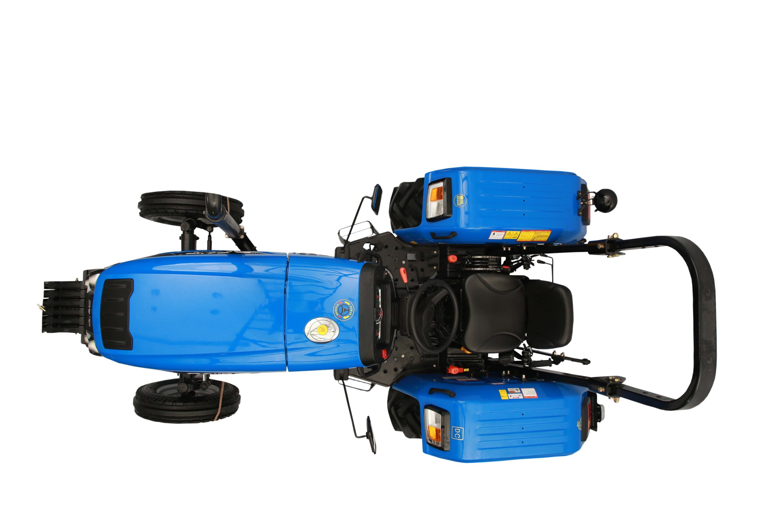 Instead of a full cab, this tractor is equipped with a ROPS (Roll-Over Protection Structure) and an adjustable sprung seat with safety belt, giving open-station visibility while still prioritising safety. The illuminated dashboard helps when working in low-light conditions, and the simple control layout keeps operation intuitive for different operators.