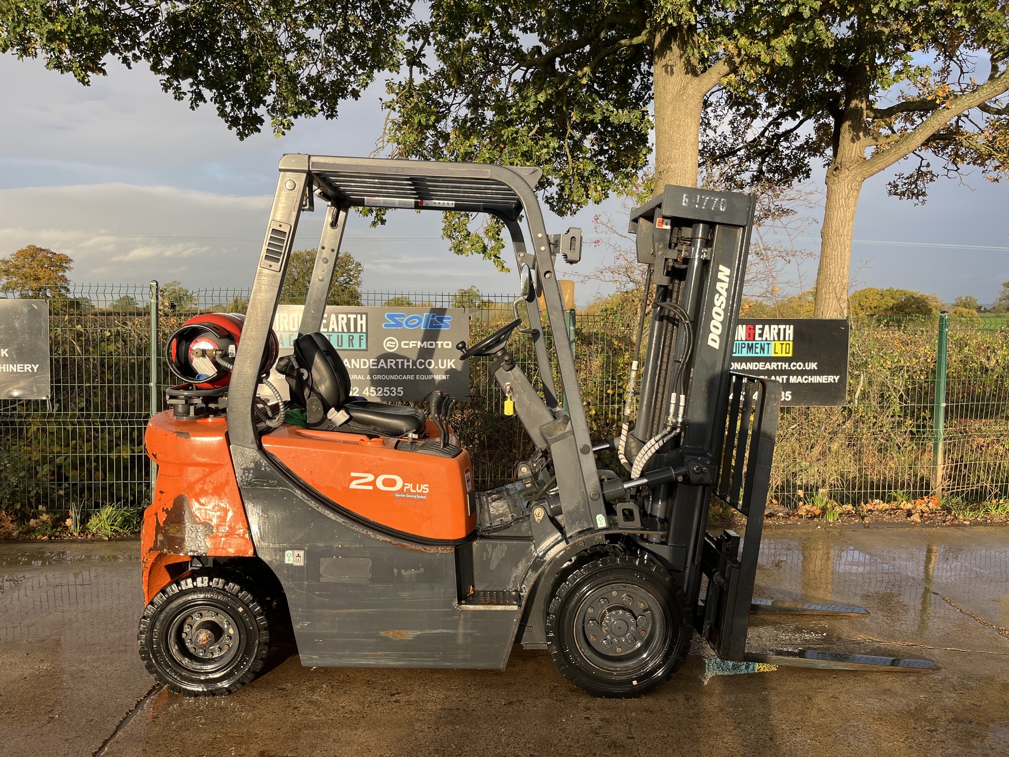 2019 Doosan G20GP 2 Tonne LPG Forklift Truck. With 2,040 Hours. Lifts 2 Tonne, Max Height 4.7m, Mitsubishi Engine, Triple Free Lift Mast, Container Spec, Side Shift, LPG. Supplied With Pallet Forks. Delivery available.