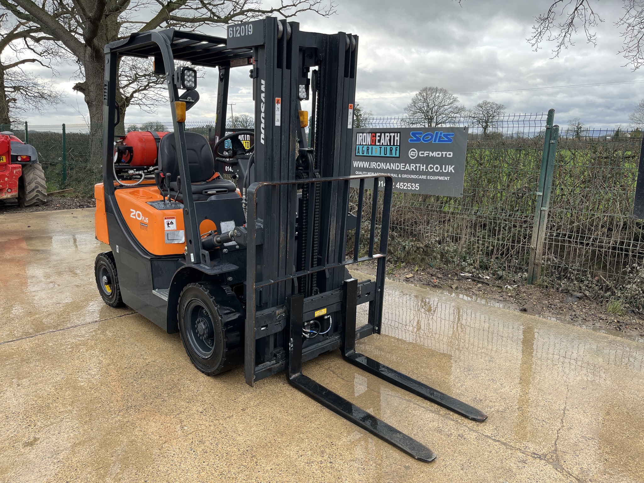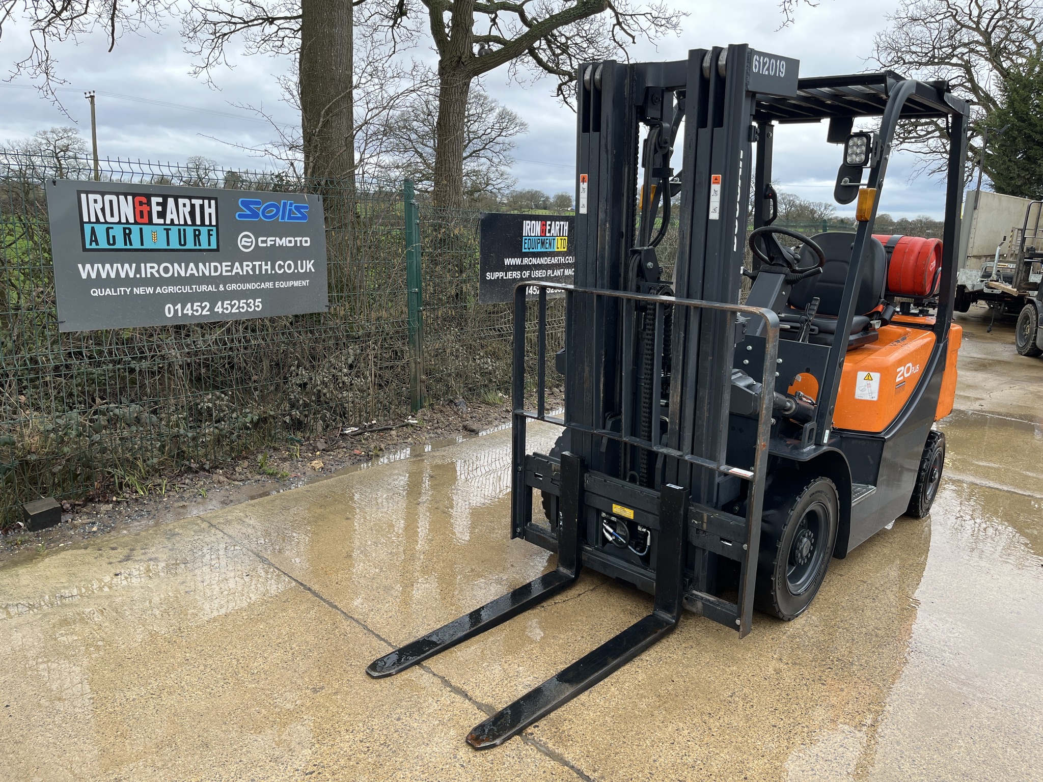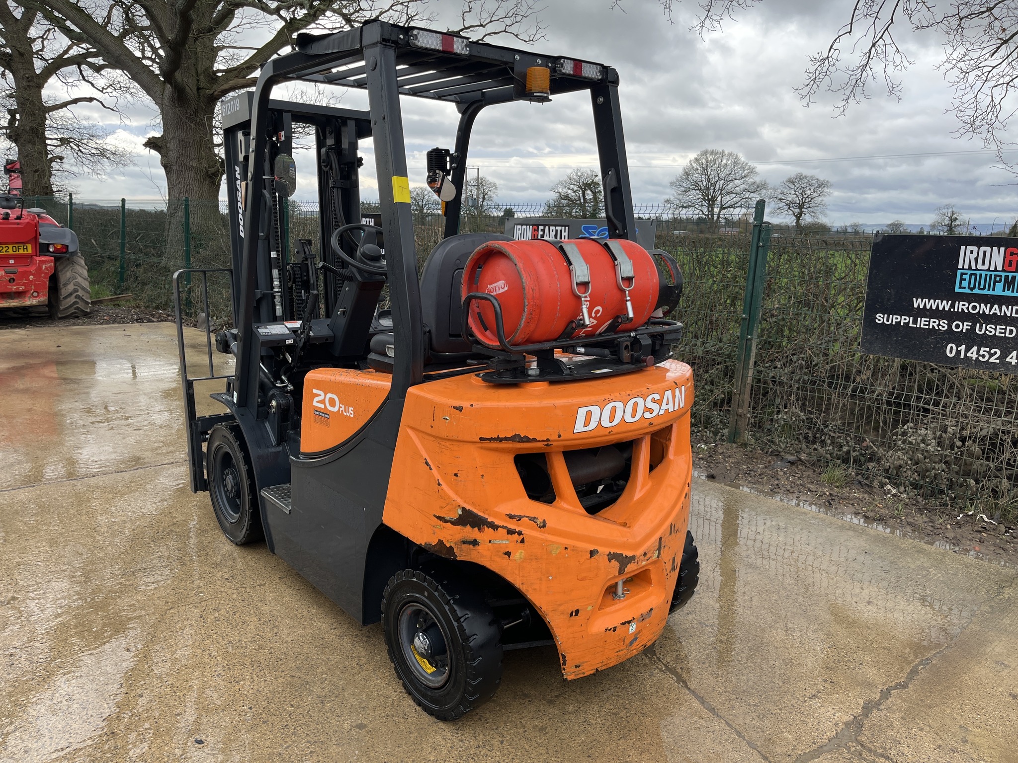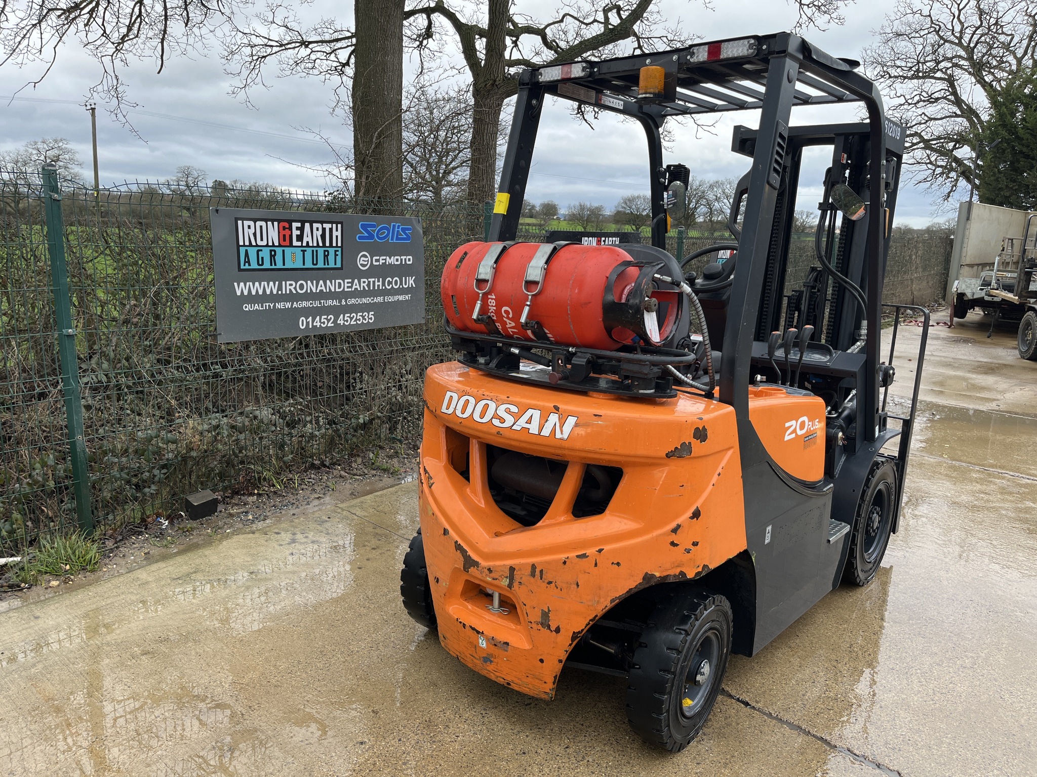 2019 Doosan G20GP LPG Forklift Truck. With 1,320 Hours. Lifts 2 Tonne, Max Height 4.7m, Mitsubishi LPG Engine, Triple Free Lift Mast, Container Spec, Side Shift, Working Lights, Amber Beacon. Supplied With Pallet Forks. Delivery available.