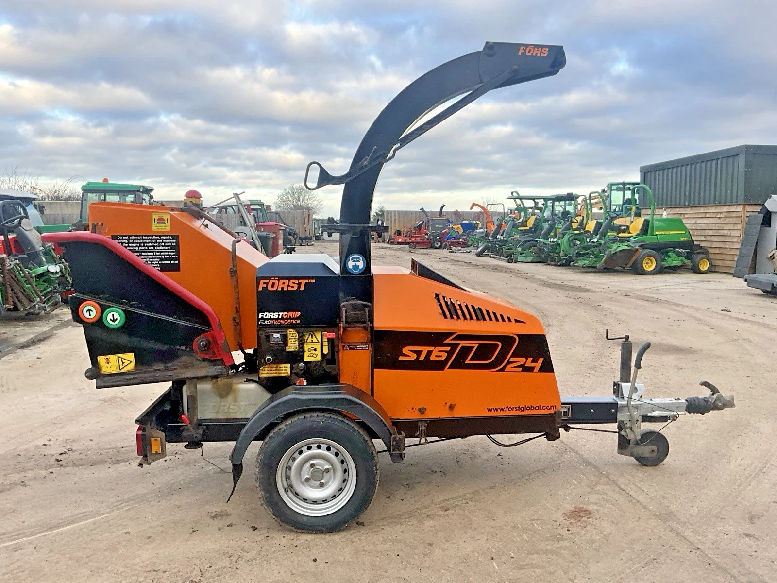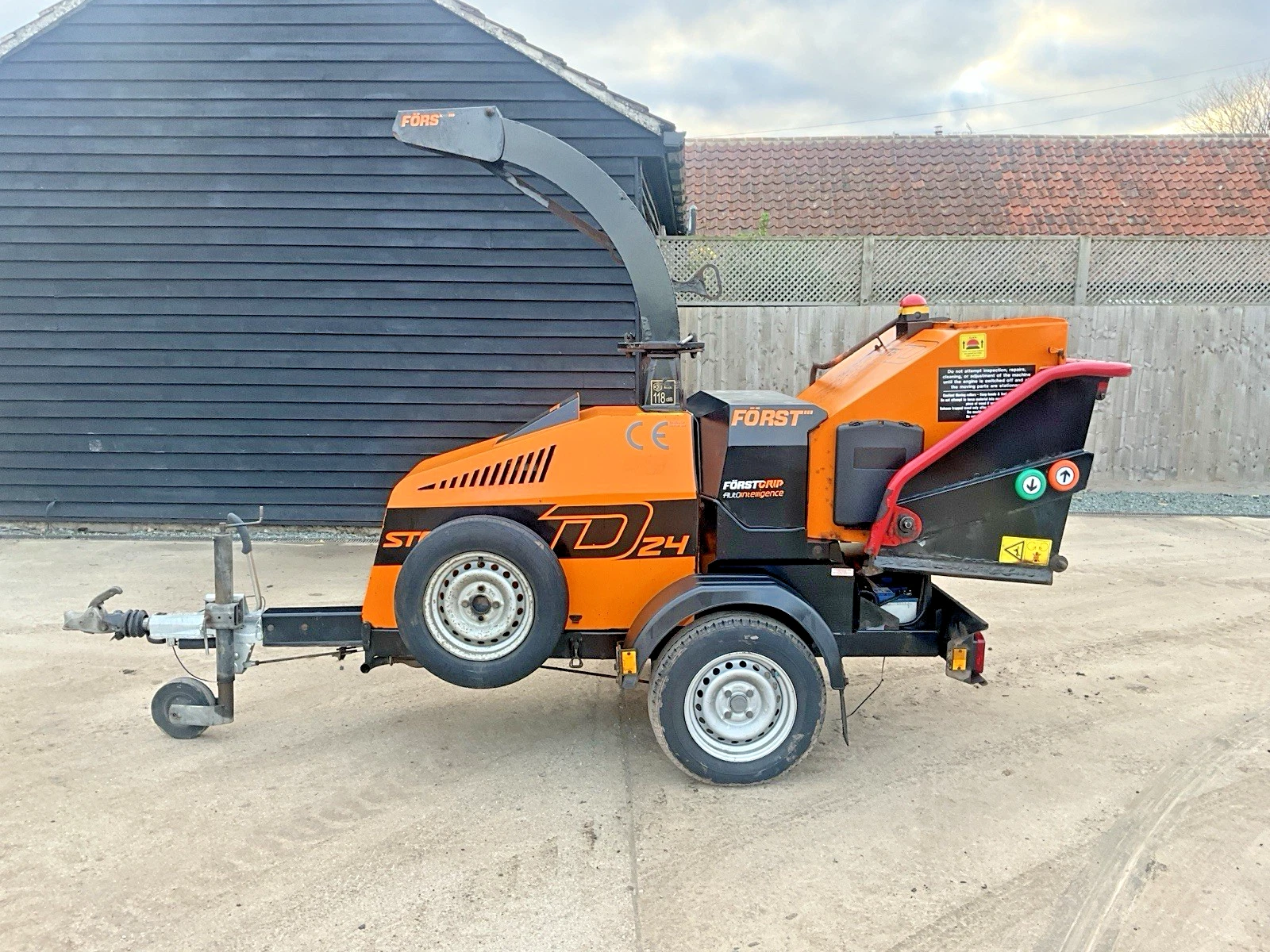2021 Forst ST6D24 Wheeled Wood Chipper. ONLY 546 HOURS USE FROM NEW. 6 Inch chipping capacity. Powered by a 24 hp Kubota diesel engine. Hydraulic feed rollers. Stress control. Starts, runs and chips faultlessly. Mounted on braked fast tow chassis. Few areas of flaking paint and light surface rust. Straight machine in good working order.