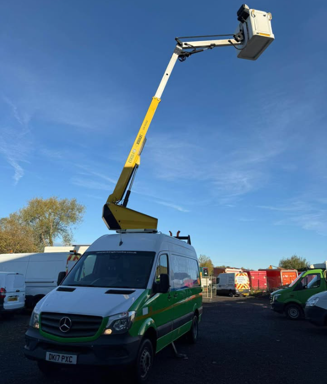 2017 17 Reg Mercedes Sprinter 514 MWB High Roof Panel Van with Cherry Picker. 43,000 miles only. Versalift Low Voltage ETM38-F Cherry Picker. 240v Inverter fitted. Full MOT and LOLER.
