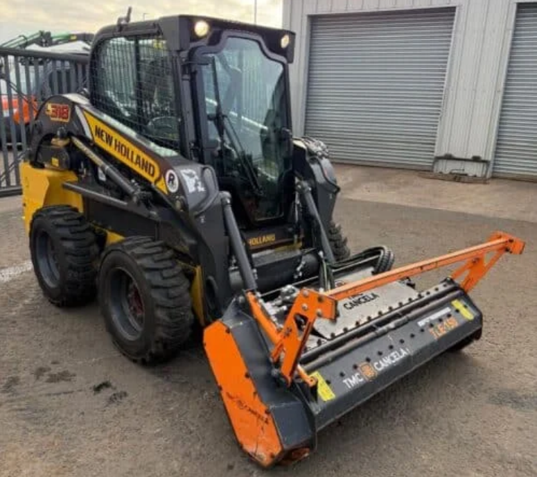 2022 New Holland L318 Wheeled Skidsteer Loader with Mulcher. 330 Hours. Complete with TMC Cancela TLE-150 Fixed Tooth Mulcher. 4-cylinder Perkins 404D-22T Diesel 57hp. 109 L/min. Loader Weight: 2550kg. Mulcher Weight: 580kg. Total Weight: 3130kg. Machine is in immaculate condition and has just been fitted with new tyres. Also supplied with a Digging Bucket, Band Tracks, and a Double Bale Spike.