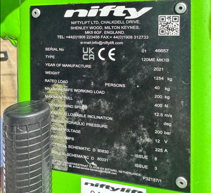 2021 Niftylift 120ME Access Platform. Working Height 12.33m. Platform Height 10.33m. Working Outreach 5m. Working Load 200kg. Wheeled. Road-towable. Will be sold with a new LOLER. Machine is immaculate, like new.