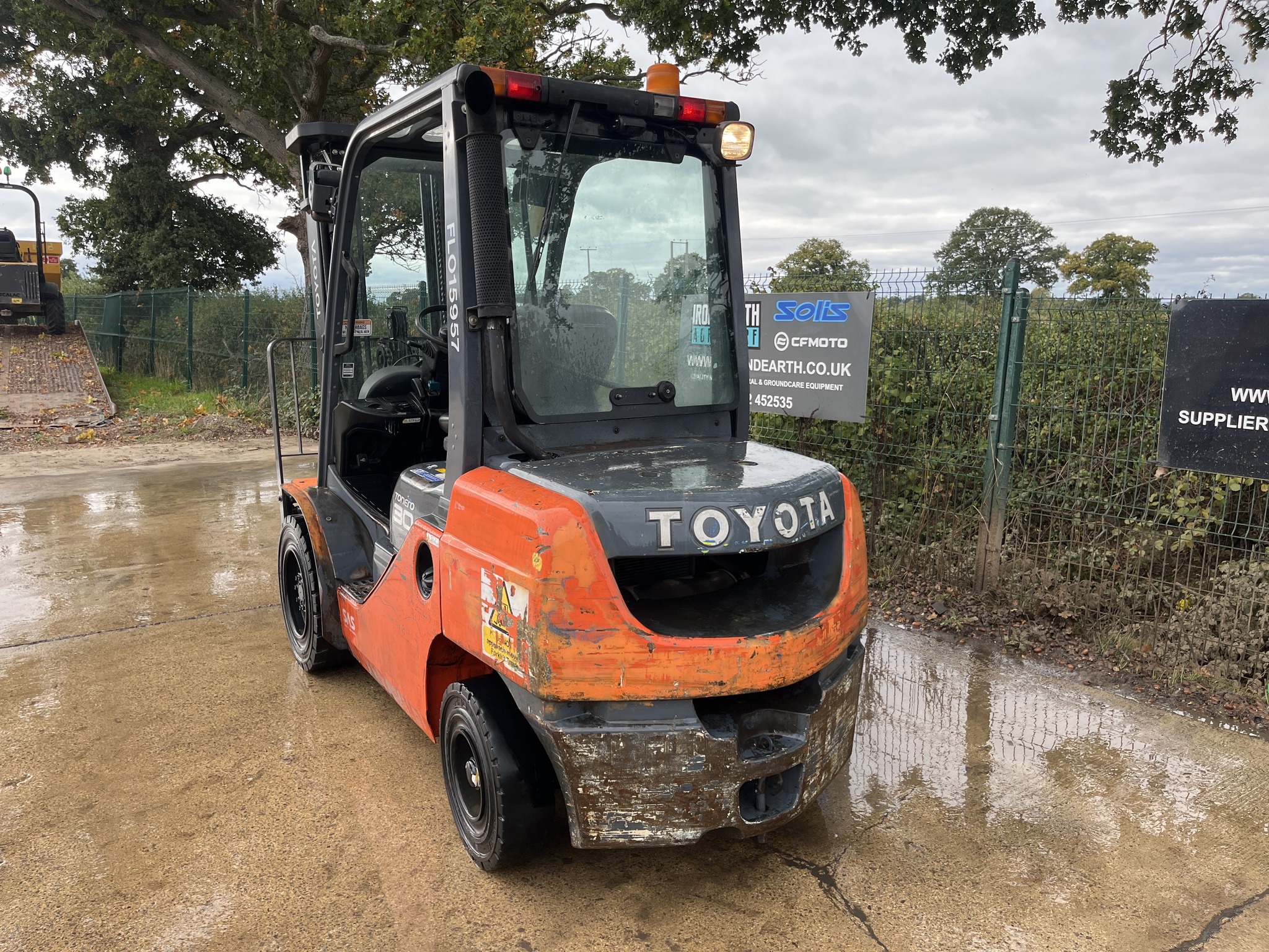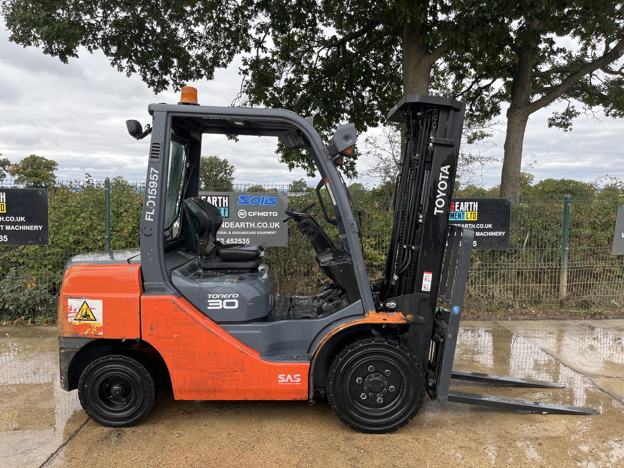 2016 Toyota 02-8FDF30 3 Tonne Forklift Truck. With 8,136 Hours. Lifts 3 Tonne, Max Height 4.7m, Turning Radius Of 2.43m, Triple Free Lift Mast, Side Shift, Auto Levelling, Amber Site Beacon. Supplied With Pallet Forks. Delivery available.