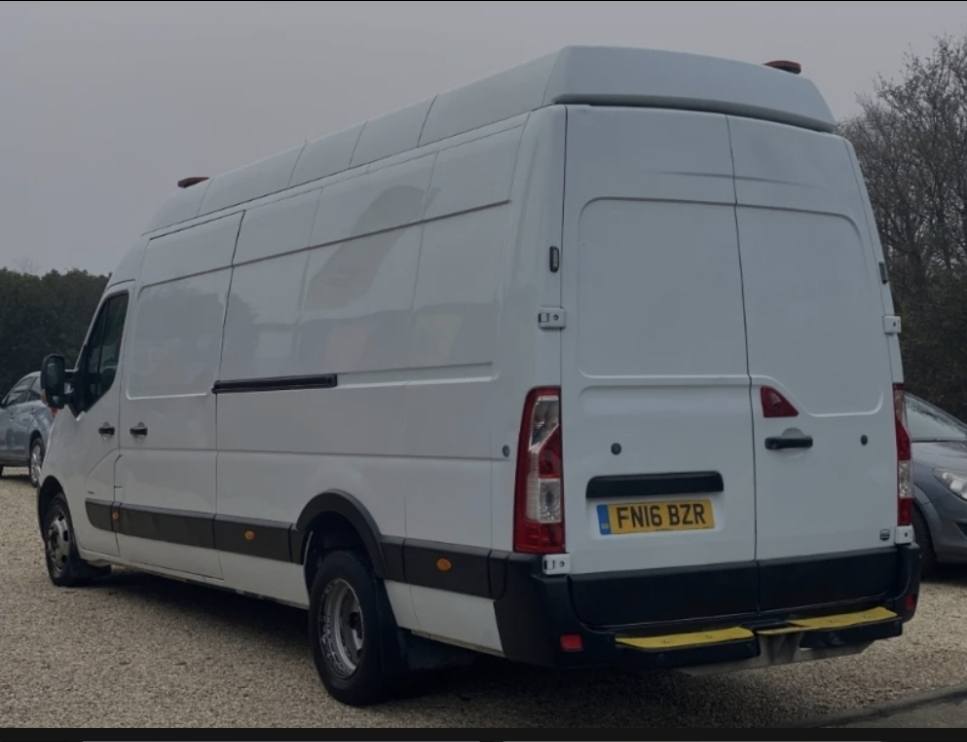 2016 Vauxhall Movano ecoFLEX HDT RWD L4 H3 Panel Van. Mileage: 82,000. Fuel: Diesel. Transmission: Manual. Drive: Rear-Wheel Drive (RWD). Emission Standard: Euro 5. Doors: 5 doors. (includes rear barn doors and side sliding door). Body Type: Luton / Panel Van (Extra Long Wheelbase – High Roof). Drivetrain: Dual Rear Wheel (DRW) – meaning it has twin wheels on the rear axle for added load stability. 12V–240V power inverter. There are a few dents on side door - see photo. MOT Expires June 2026. Recently Serviced. Drives perfect. Test drives welcome.